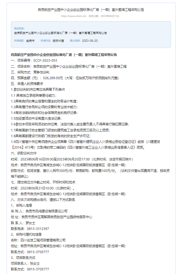 自贡航空产业园中小企业创业园标准化厂房(一期)室外围墙工程采购公告
