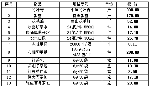 二、采购项目:凤鸣国际酒店茶叶、茶包、矿泉水及一次性纸杯采购。