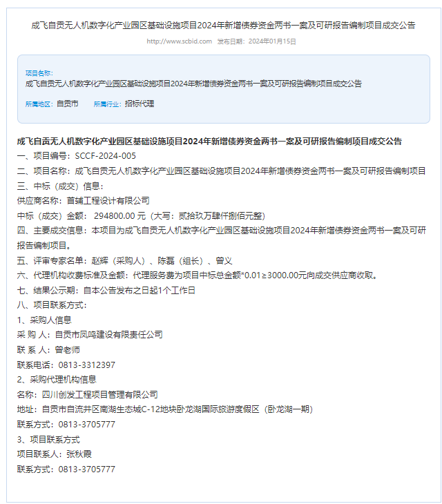 成飞自贡无人机数字化产业园区基础设施项目2024年新增债券资金两书一案及可研报告编制采购成交公告