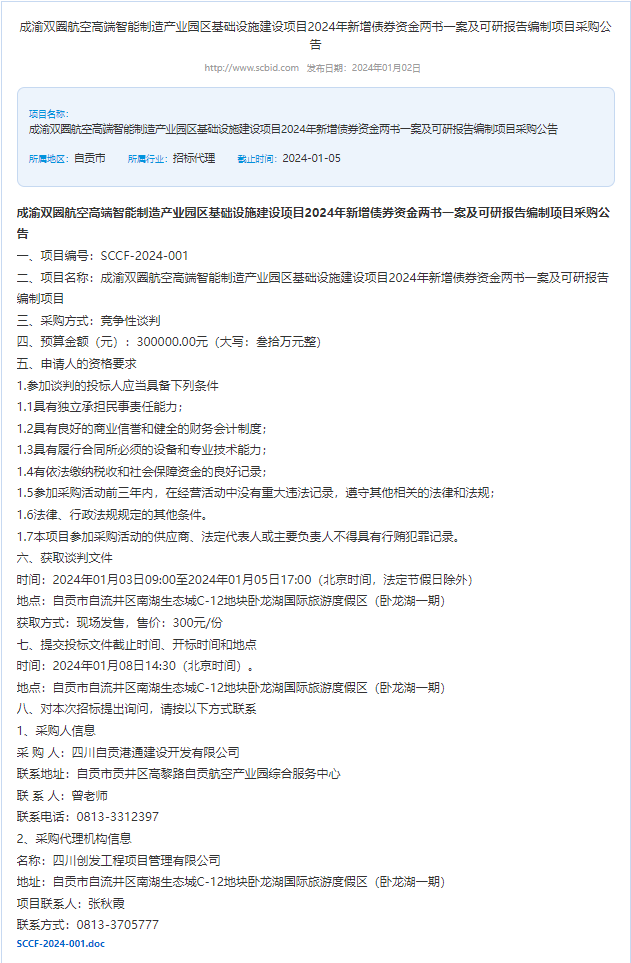 成渝双圈航空高端智能制造产业园区基础设施项目2024年新增债券资金两书一案及可研报告编制采购公告