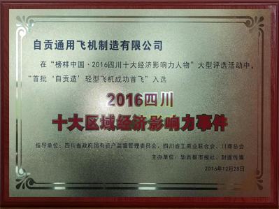 自贡通用飞机制造有限公司获2016四川十大区域经济影响力事件